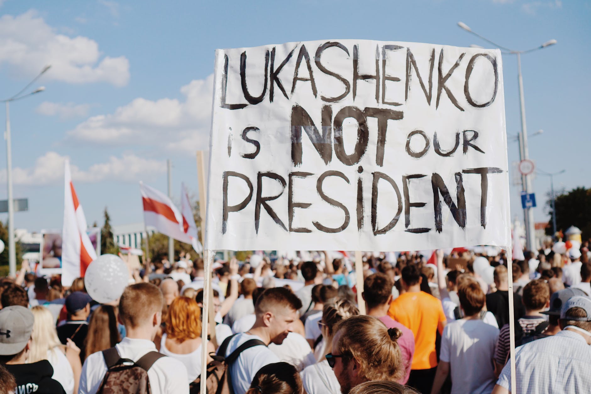 Manifestanţii purtau steaguri roşu-albe ale Opoziţiei şi scandau sloganuri precum ”Lukaşenko în furgon celular!” sau ”Pleacă!”, potrivit unui jurnalist AFP.